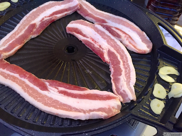 サムギョプサルを外の飲食店で食べたことはありますが、家庭でやることは初めてです。こんな専用の鉄板があるとは知りませんでした。食べるのに夢中で、これ以上の画像はありませんので、ご了承ください。食べ方は至って簡単。サンチェやサニーレタス、またはグリーンリーフを用意します。その葉っぱの上に、焼いた豚肉に、スライスしたニンニクを炒めたもの、あとはもやしや山菜、ほうれん草などのナムルを乗せて、くるっと巻いて食べるだけ。