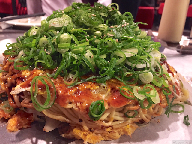 締めに出てきたのが、この広島風お好み焼きです。既に一枚食べているのですが、追加でもう一枚でてきました(汗)広島風お好み焼きの中でも、流行があるようで、「麺パリ」というのが今の人気のようです。焼きそばの麺の表面をパリと香ばしく焼き上げ、パリッとした食感を残したものです。このようなメニューは地元の方と一緒に来ないと食べることができませんね。もし次同じ店に来たとしても、ちょっと恥ずかしさもあって、通のメニューは注文しにくいことありませんか?