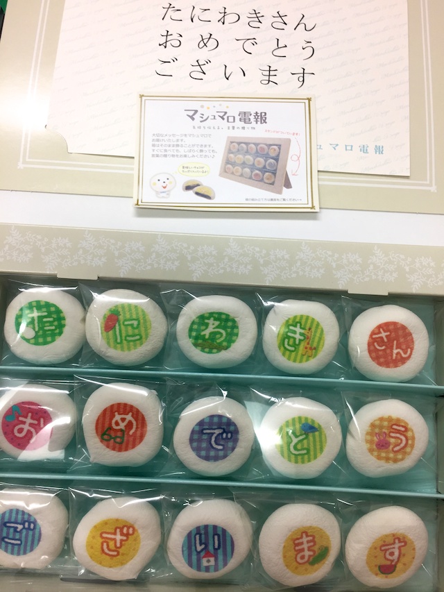 思わず近くにいたパートさんを捕まえて、「ちょっと、見て見て。」とこのマシュマロ電報を見せたところ、「キャー!」と奇声を上げるほどでした。男性で喜ぶぐらいですから、女性はもっと喜ぶことでしょう。