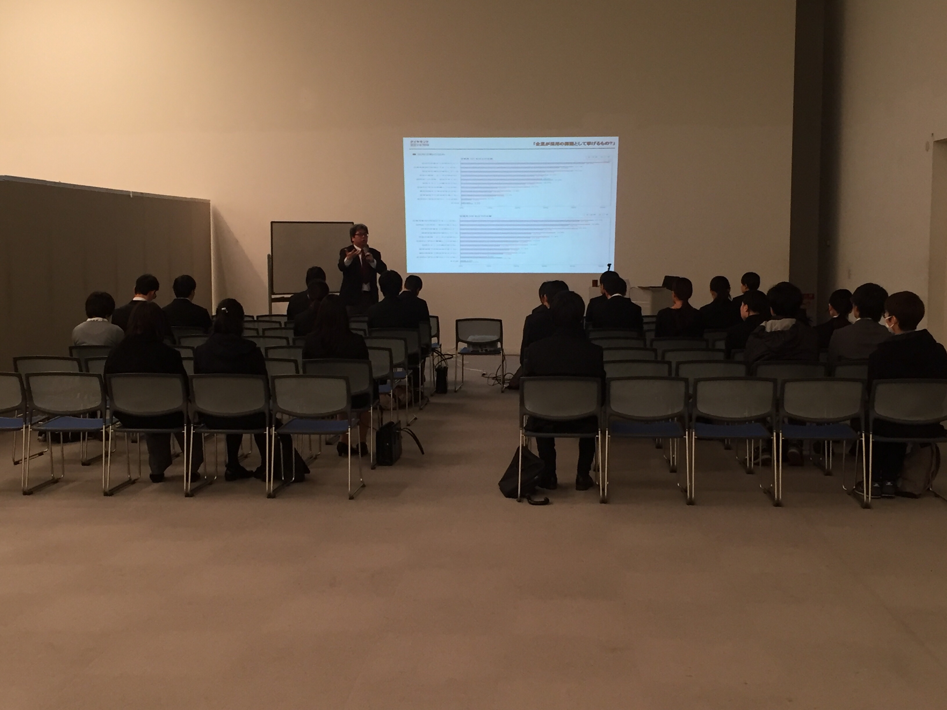 企業との面談の前に、ゼミが開催されていましたが学生の参加はまばらでした。一番驚いたのは、保護者向けの就活セミナーが開催されていたことです。私の想像以上に保護者の方がいらっしゃったのが印象的でした。