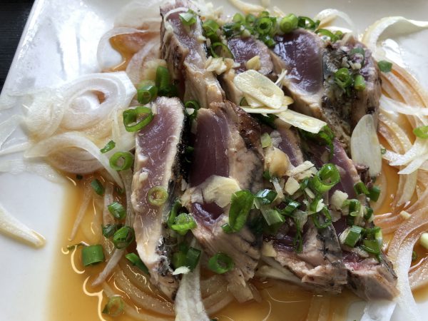 残念ながらびやびやかつおは諦めてレギュラーのかつおのタタキ定食を注文しました。やはりこちらの地区は醤油やポン酢は甘めの味付けです。