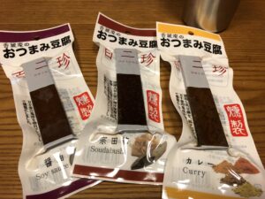 スモークされて豆腐はお酒が進むので困っちゃいますね。なんと全部で8種類の味があるようです。画像には写ってませんが、私個人的には「山椒」「七味」など香辛料のフレーバーが好みです。私はこのままかぶりついちゃいましたけど、大勢で飲むときのおつまみは、スライスしてお皿に盛り付けてもいいですね。末広ショッピングセンターのお酒売り場で販売していますので、ぜひ一度食べていただきたい。