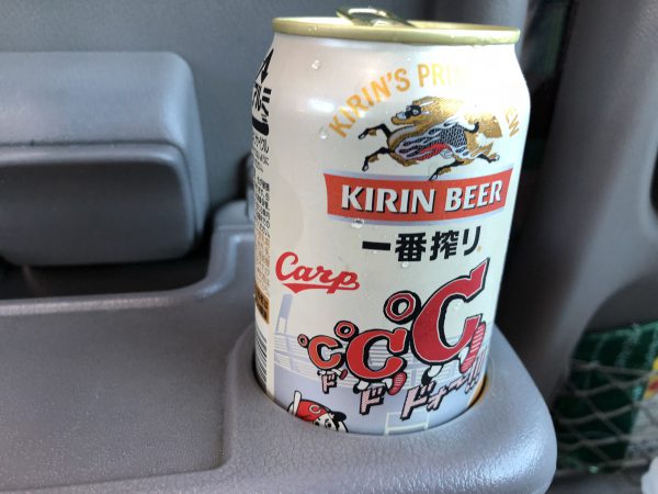 さて、朝に宮島を後にし、次なる観光をしながら高知に帰ります。まずは、二日目も朝ビールからスタートです。広島カープ仕様の一番搾りがあるのですね。