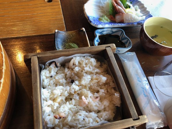 タコ飯などこの地ならではの食事をいただきました。もちろんお酒も欠かさず飲んでいますよ。