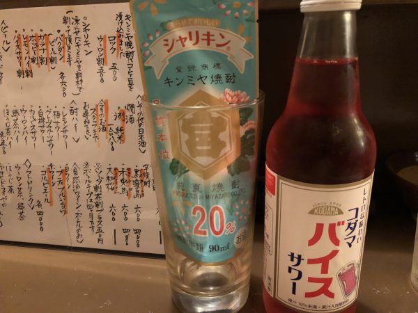 初めて「キンミヤ焼酎」と言うものを飲みました。シャリキンと言う商品名で、実は甲類の焼酎が凍っております。シャーベット状の焼酎をグラスに入れて、右側にあるサワーを注ぐと言うものでした。ご家庭でも味わうことができる焼酎のようです。