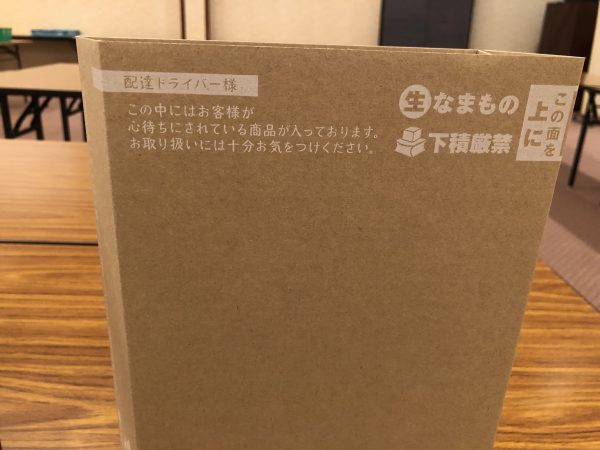 こちらはそのギフト箱の上にかぶせる専用のカバーの箱です。配達されるドライバーさんに向けてのメッセージを書かせてもらいました。配達する際には注意書きのシールをベタベタと貼る必要があるのですが、せっかくのお届け物の見栄えが悪くなるので、必要最小限にしたいと考えてこのようなデザインになりました。