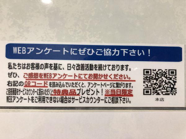 上の画像にある通り、スマホやタブレットからQRコードを読み取るだけで、すぐにアンケートにお答えできることができます。わざわざ紙に書くのは面倒臭い、覚えているうちに要望を伝えたい。などそんなことがなくなりました。