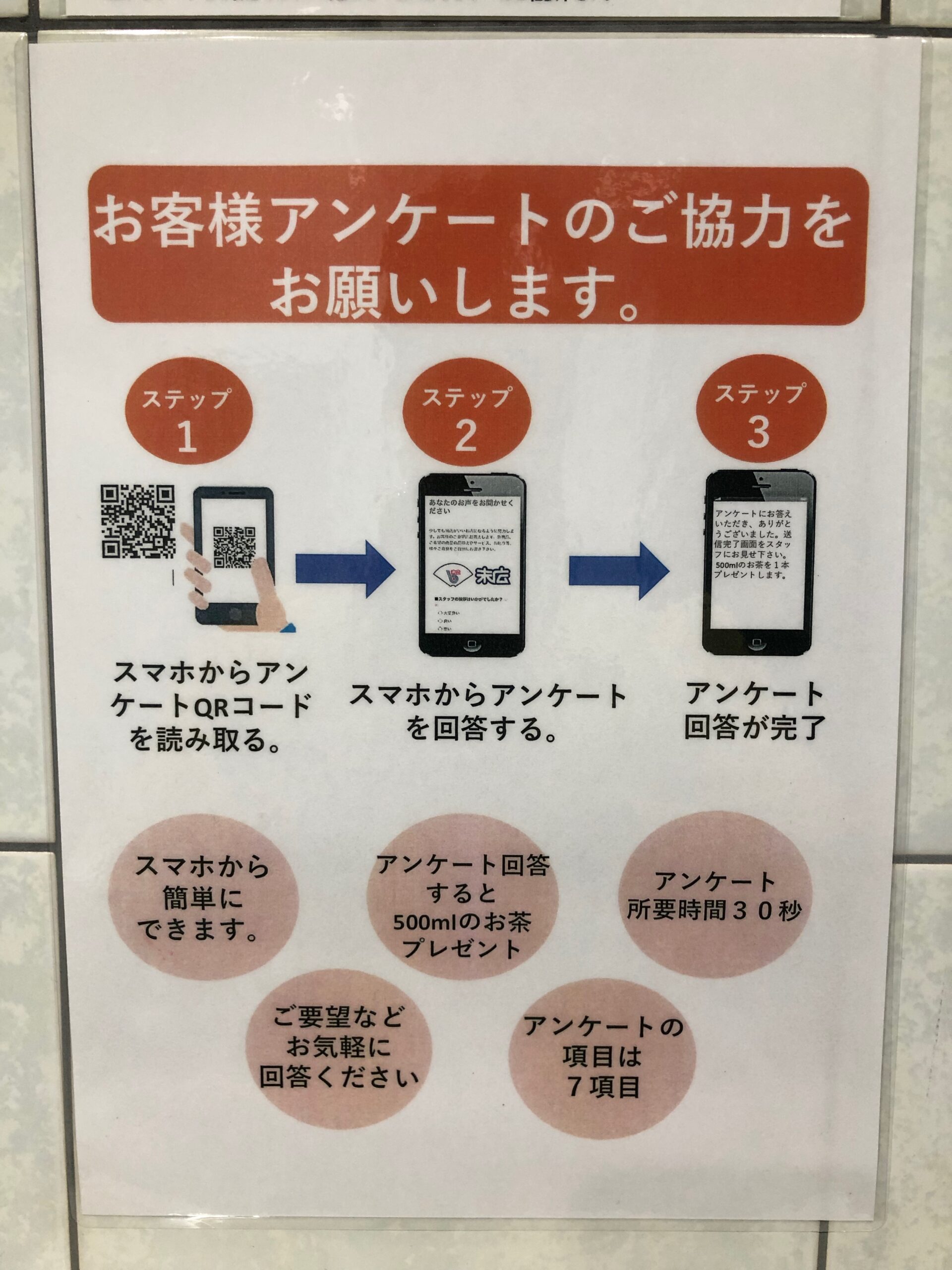 この仕組みを導入するまで知りませんでしたが、今のスマホはわざわざQRコードを読み取るアプリを立ち上げなくても、カメラの機能からすぐにそのリンク先に飛ぶことができるのですね。アンケート完了画面をサービスカウンターに見せていただくと、500mlのペットボトルのお茶をプレゼント。