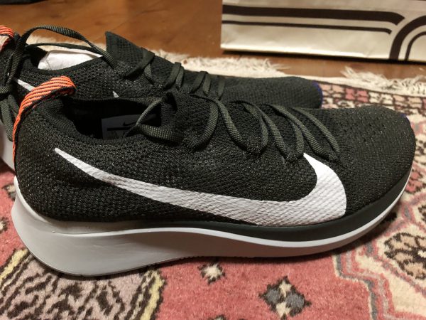 昨年は靴底が薄いタイプのシューズで望みましたが、これが痛い思いをしましたので、今年は厚底のシューズで望む事にしました。一番上の画像にある通り、まだタグを付いていますので、おろしたてになります。私が購入したのは、ナイキ ズーム フライ フライニットというシューズです。ほんとは、ナイキ ヴェイパーフライ 4% フライニットというものが欲しかったのですが、なかなか手に入らないモデルです。ヴェイパーフライは、アスリート用のモデルですので非常に高価です。ズーム フライは、ヴェイパーフライの機能を有しながら、市販用に販売されたモデルのようです。