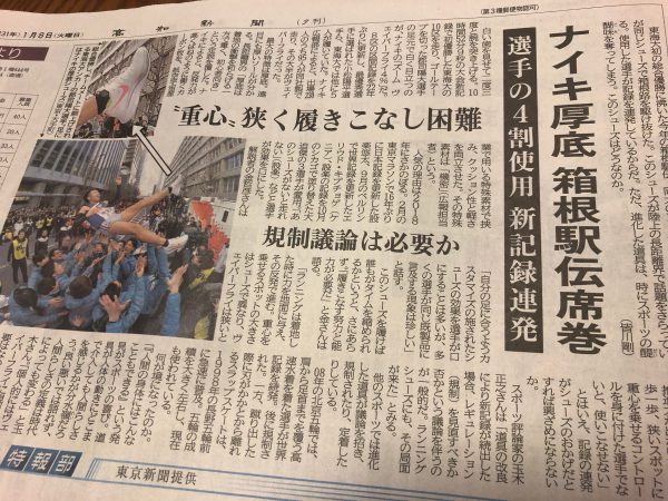 先日の高知新聞夕刊には、このような記事が出ていました。ナイキの厚底シューズが業界を席巻しているとか。私もその波に乗ったような感じになってしまいました。業界から認められるということは、非常に素晴らしいシューズということが伺えます。