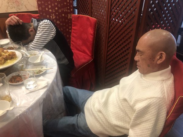 神戸の中華街に行きましたが、もちろん中華と言えば紹興酒ですね。右上に少し見えているのが、紹興酒です。しかしながら、バスの中で結構な量を飲んでいますので、食事もお酒も進みません・・・なんと!気がつくと、こんな状態の社員がいました。