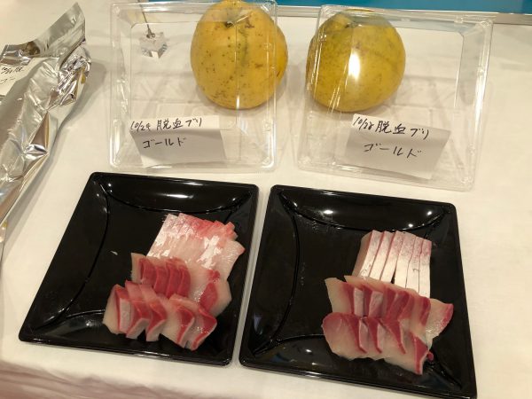 更に驚いたのは、脱血ブリに香りをつけることができるのです。今回は河内晩柑という柑橘類で味付けしたものです。食べてみると微かに酸味を感じることができ、また違った刺身として、美味しく味わうことができます。