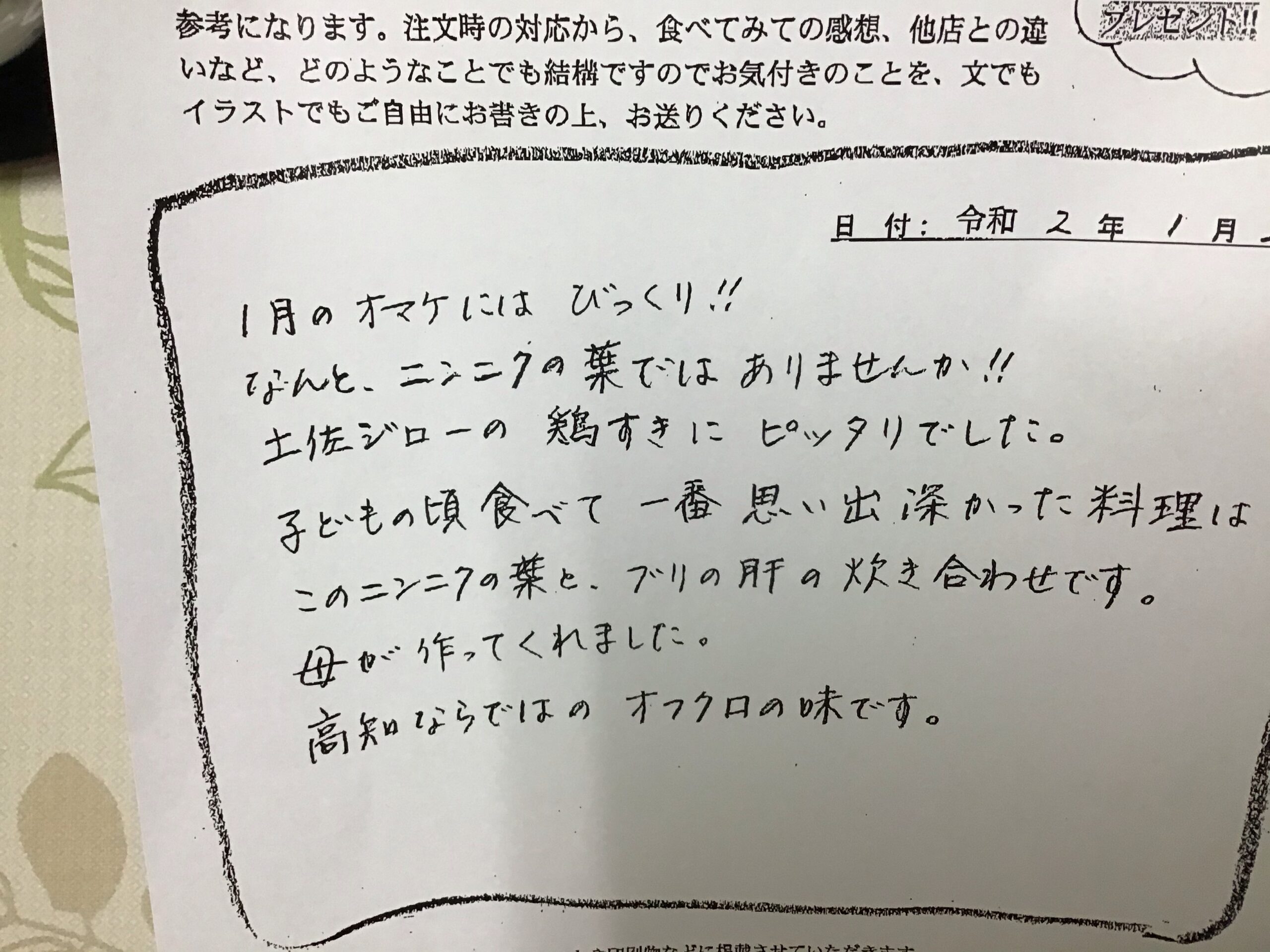 1月の旬の頒布会につけた「おまけ」の「ニンニク葉」のお客様の声。