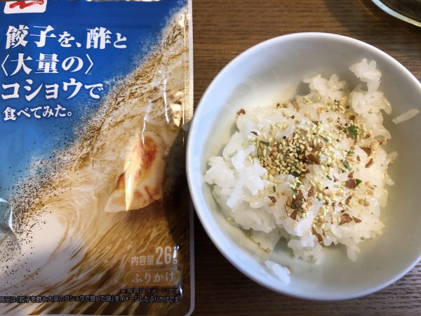 更には、「餃子を酢と大量のコショウで食べてみた」のふりかけも食べてみました。こちらも実際にはやったことがないので、味のイメージがしずらかったですが、美味しかったです。お酢の酸味が引き立っていました。