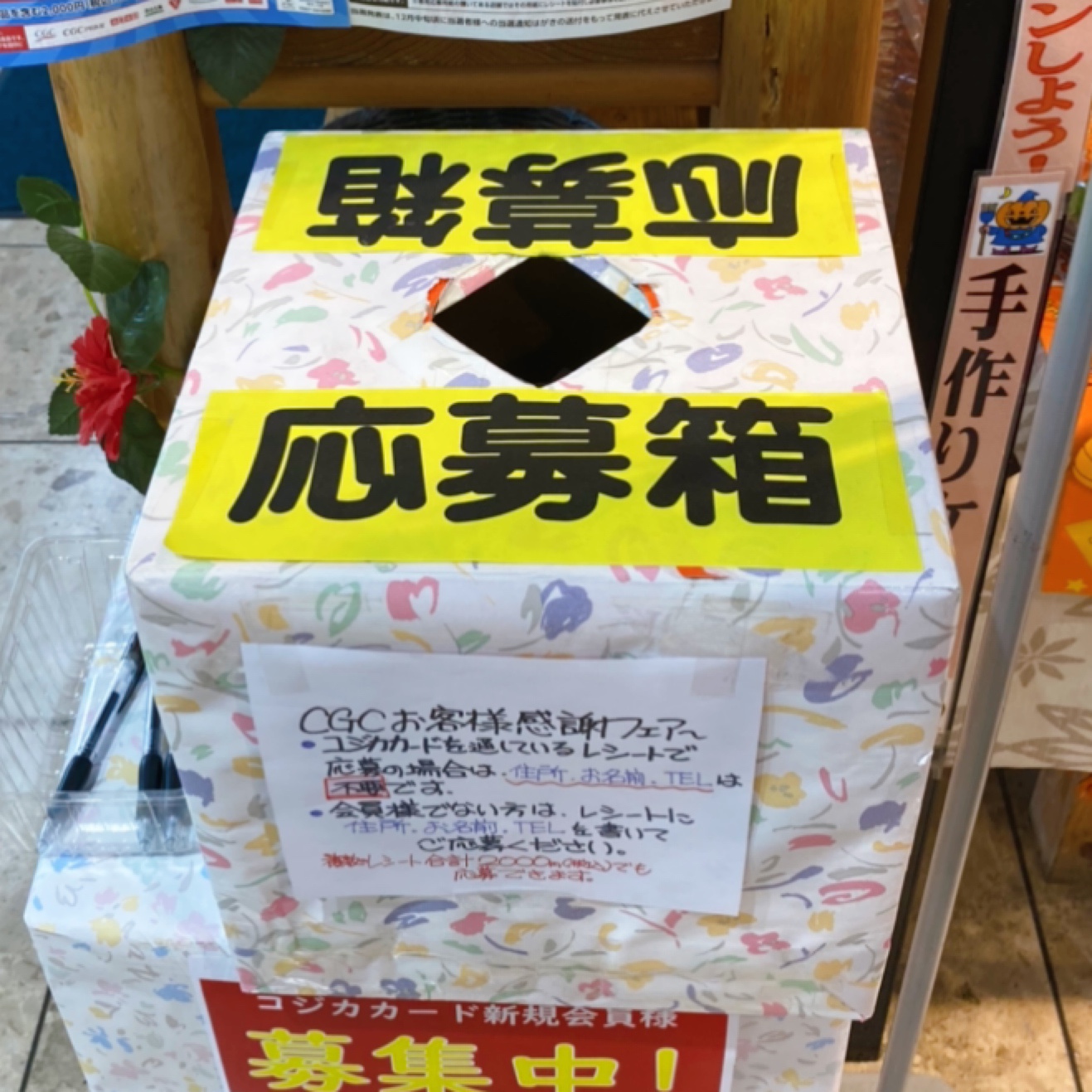 応募箱、本店は店舗東入口を入ってすぐのところに置いてあります。