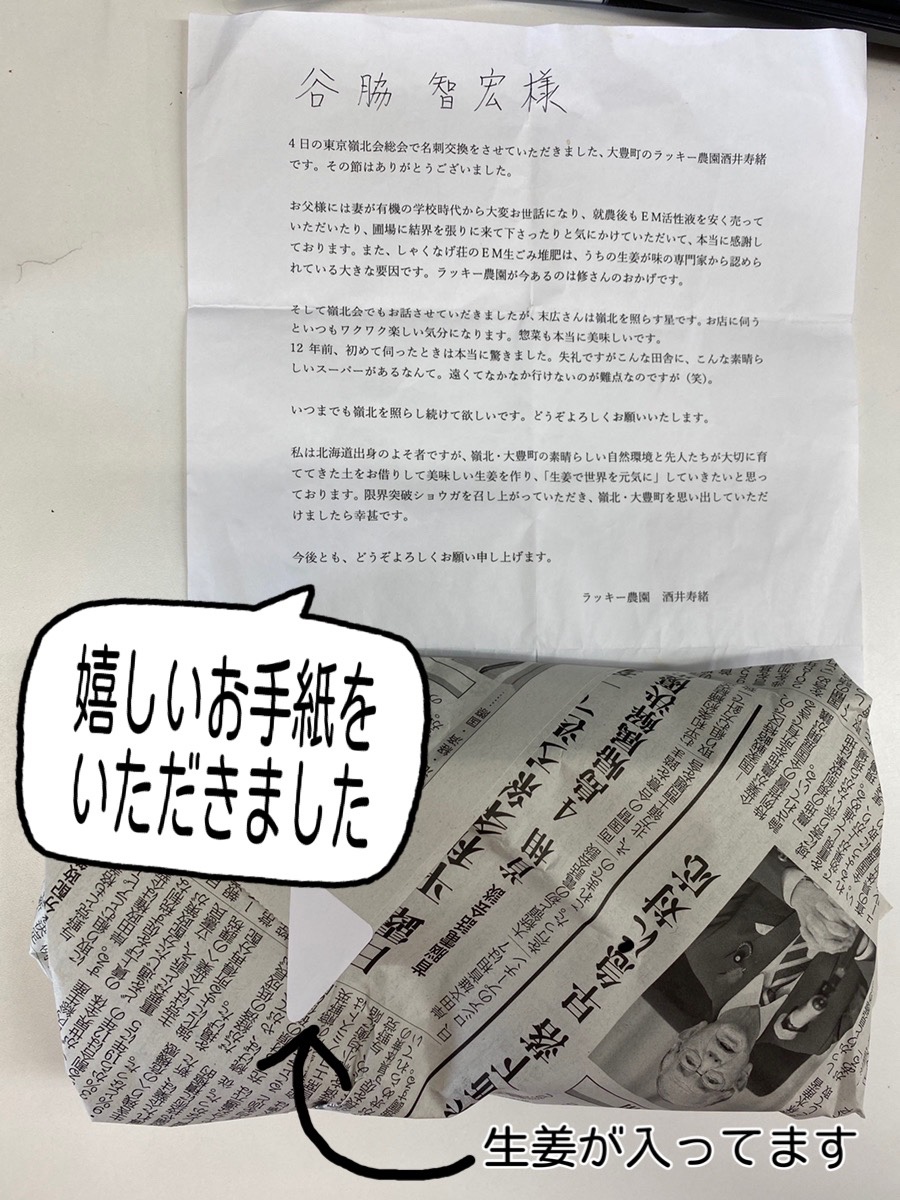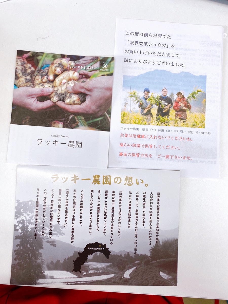 こないだの土曜日、東京嶺北会に参加させていただいた時に出会ったラッキー農園さんが心温まるお手紙と限界突破生姜をいただきました。