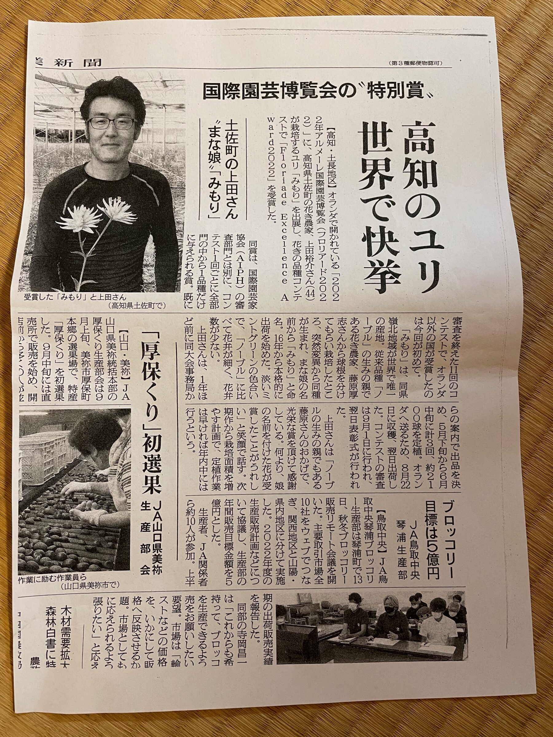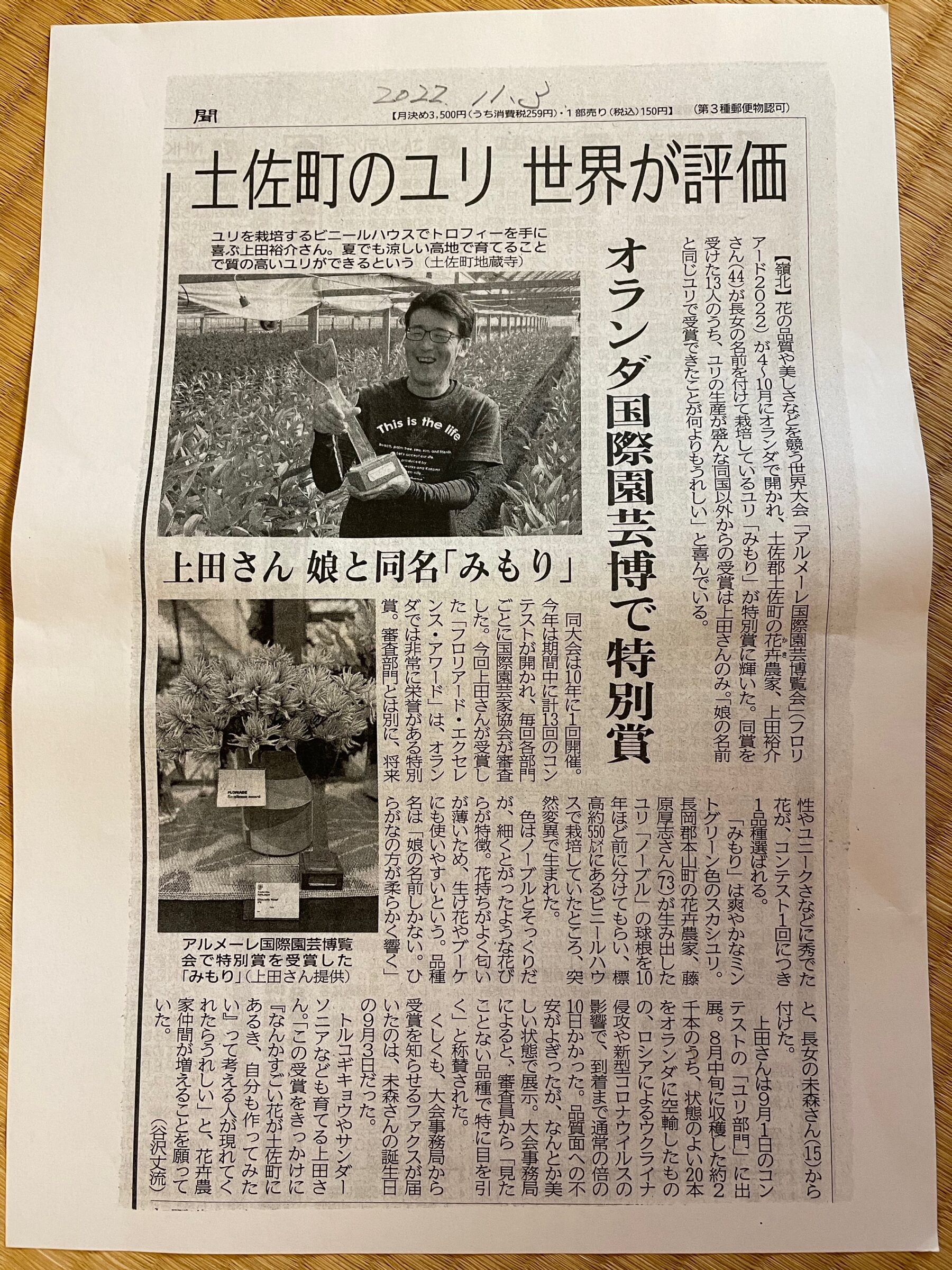 とにかく土佐町で栽培されたユリが世界で表彰されたという、地域に元気を与える素晴らしいことです。