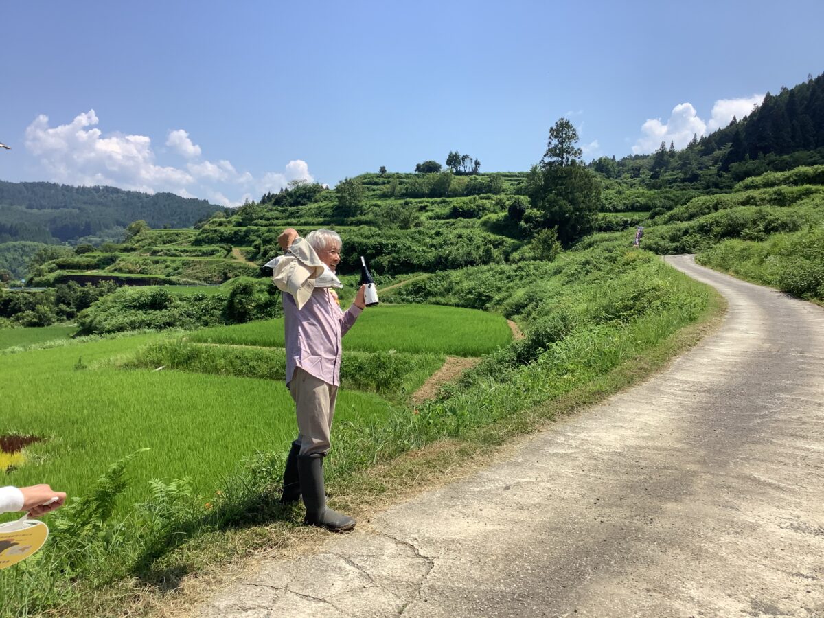 右肩に5キロのお米を担ぎ、左手に修さんが育てた酒米でつくったお酒「山」を持ち