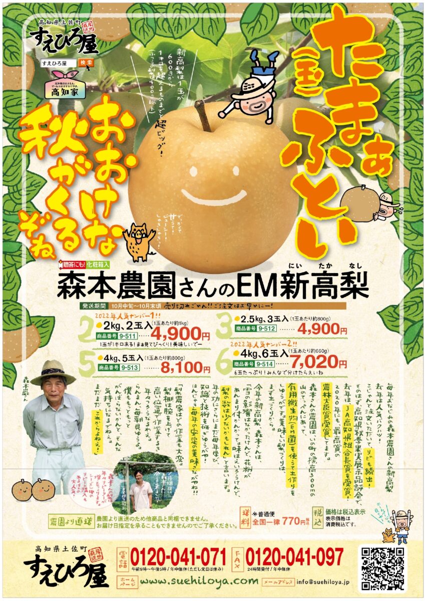 このチラシでは、森本農園さんの新高梨を紹介しています。