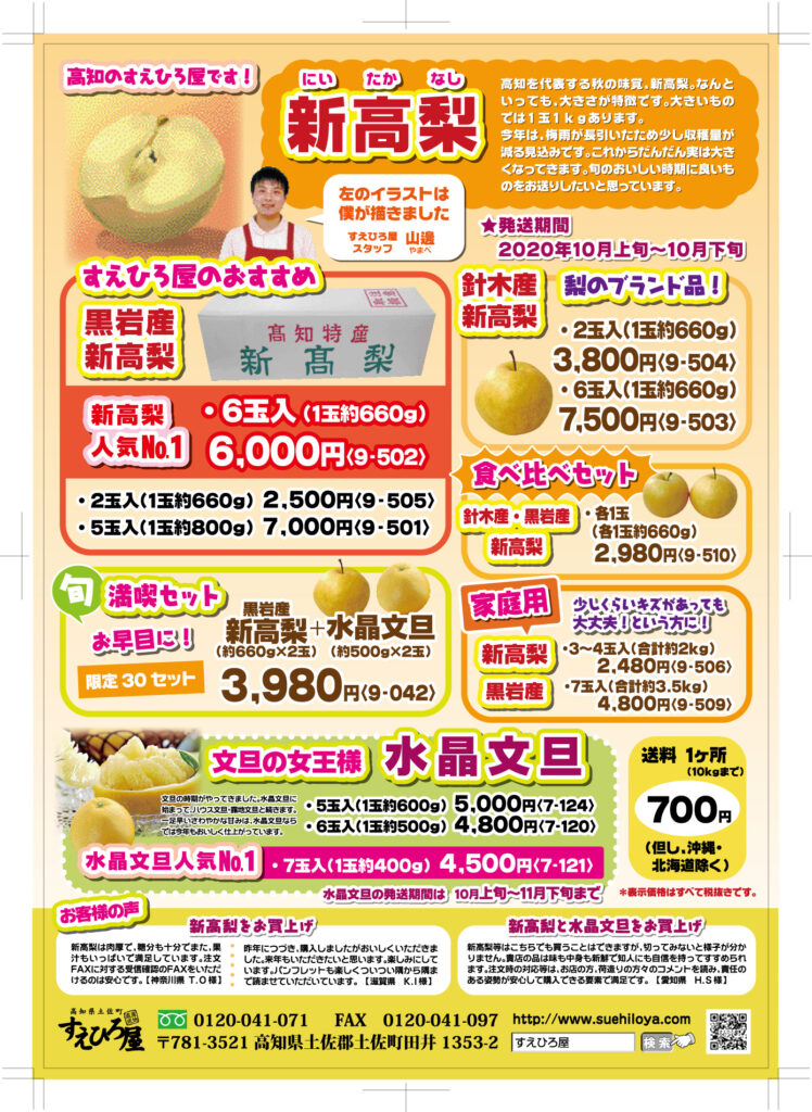 2020年新高梨、販売終了しました2020年の新高梨、販売終了しました! たくさんのご注文ありがとうございました!! 11月上旬には、すえひろ屋年末ごちそうカタログを みなさまにお届けする予定です! 今回は、頒布会のカタログも一緒です。 楽しみにしていてください。 本...高知の美味しい物をお届けする「すえひろ屋」社員のブログueta