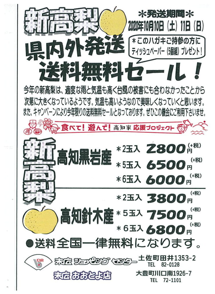 2020年10月10日・11日は新高梨発送、送料無料セール!今週末10月10日(土)と10月11日(日)は 店頭からの新高梨発送 送料無料キャンペーンを開催いたします。 末広本店、末広おおとよ店に来店いただき お申込みいただいた方が対象です。 ぜひ、末広にお越しくださいませ! 今回の送料無料セールは 高...高知の美味しい物をお届けする「すえひろ屋」社員のブログueta