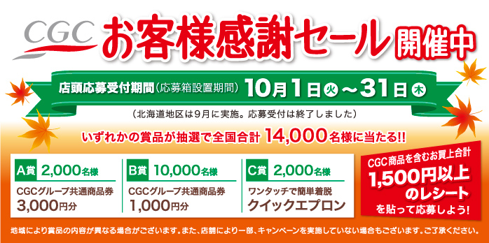 10月1日(火)〜10月31日(木)の期間中に、 CGC商品を含む1500円以上お買上げのレシートで 何回も応募することができます。 CGCの商品券が当たるお客様感謝セールにぜひご応募下さいませ。