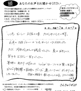 主人の母(高知出身)を連れて高知旅行を計画していましたが、84歳と高齢でもあり断念しました。ネットで御社を見つけ、サプライズがあるよと母を招き、田舎寿司や蒲鉾、羊羹やウナギを大皿に盛りつけました。すごく喜びました。また高知のうるめも大好きで大阪でも探して遠くまで出かけていたほどです。毎年1度は高知に旅行に行き日曜市などにも行っていましたが、気軽に注文もでき、これからはちょくちょく利用させていただきます。 今回、3回注文し、変更等で電話でお話した時も、高知弁(私は徳島出身ですが)が懐かしく、また元気で明るい高知人気質を感じました。明るい高知の空と海を見に今年もぜひ帰ろうと思っています。