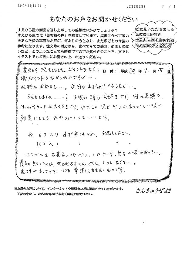 注文しましたー!子供も孫も大好きです。特に黒糖のはいからケーキが大好きです。やさしい味でどこかなつかしい味で朝食にしてもおやつにしてもいいです。