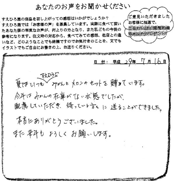 夏はいつもすえひろでみかんとメロンのセットを贈っています。