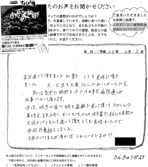 今は、地方の食べ物を通販で送って頂いて楽しんでおります。昨年12月に、ギフトセンターからの注文書で、すえひろ屋様の土佐のパイまんを送って頂き、とても美味しかったので、今回お電話をしました。