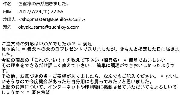 その他、お気づきの点・ご要望がありましたら、なんでもご記入ください。 = おいしいそうなので、今度機会があったら自分用にも買ってみたいと思いました。