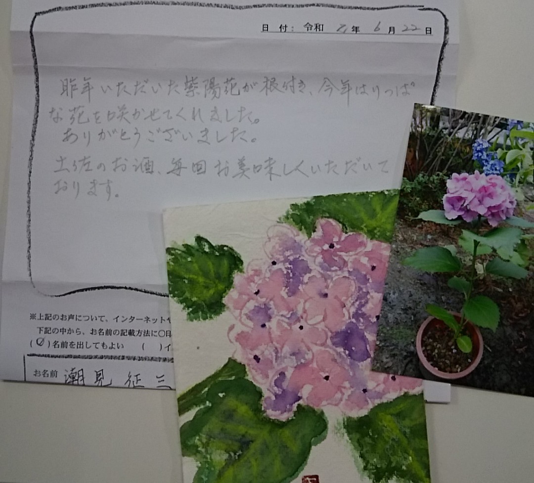 毎年6月は、すえひろ屋のある土佐町の町花・あじさいを同梱させていただいておりました。