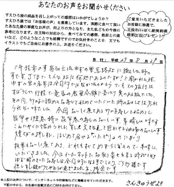 H・K 様 【田舎寿司のご試食せっと をお召し上がりいただきました。】