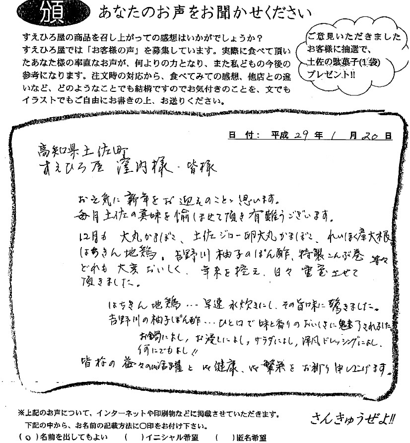 高知県土佐町 すえひろ屋 窪内様・皆様 お元気に新年をお迎えのことと思います。毎月土佐の美味を愉しませて頂き有難うございます。12月も大丸かまぼこ、土佐ジロー卵大丸かまぼこ、れいほく産大根、はちきん地鶏、吉野川柚子のぽん酢、特製こんぶ巻等... -
