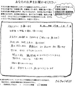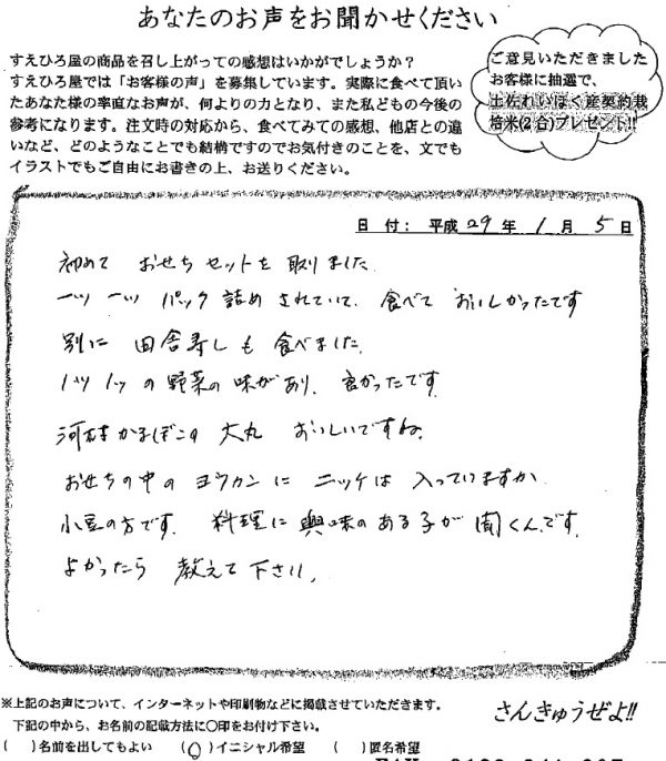 新年を当社のお料理で過ごしいただき、誠にありがとうございます。美味しく召し上がっていただけて本当に良かったです。大丸、美味しいですよね! 玉子がまるごと2個も入って、美味しさにも見た目にもビックリですよね。当社でも大変人気商品となっております。 すえひろ屋のようかんは全て手作りしておりまして、あずき・ニッケイ・ゆず・栗の4種類の味がお楽しみいただけます。あずきようかんにニッケイは入っておりません。ニッケイようかんも大人気商品です!ぜひ機会がございましたらご賞味下さいませ。今後ともよろしくお願い致します。ありがとうございました。