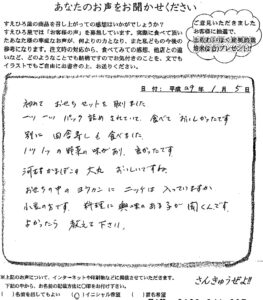 別に田舎寿しも食べました。1つ1つの野菜の味があり、良かったです。河村かまぼこの大丸おいしいですね。おせちの中のヨウカンにニッケは入ってますか。小豆の方です。料理に興味のある子が聞くんです。よかったら教えて下さい。