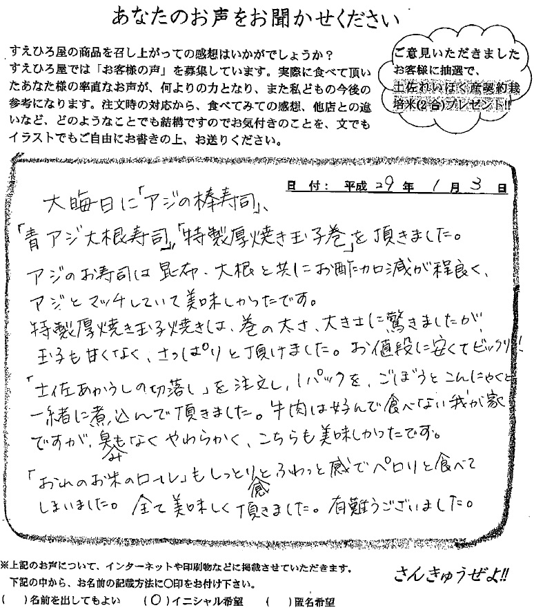 A.M. 様 (埼玉県) 【アジ棒寿司・青アジ大根寿司・土佐あかうし切落し等をお買い上げいただきました。】