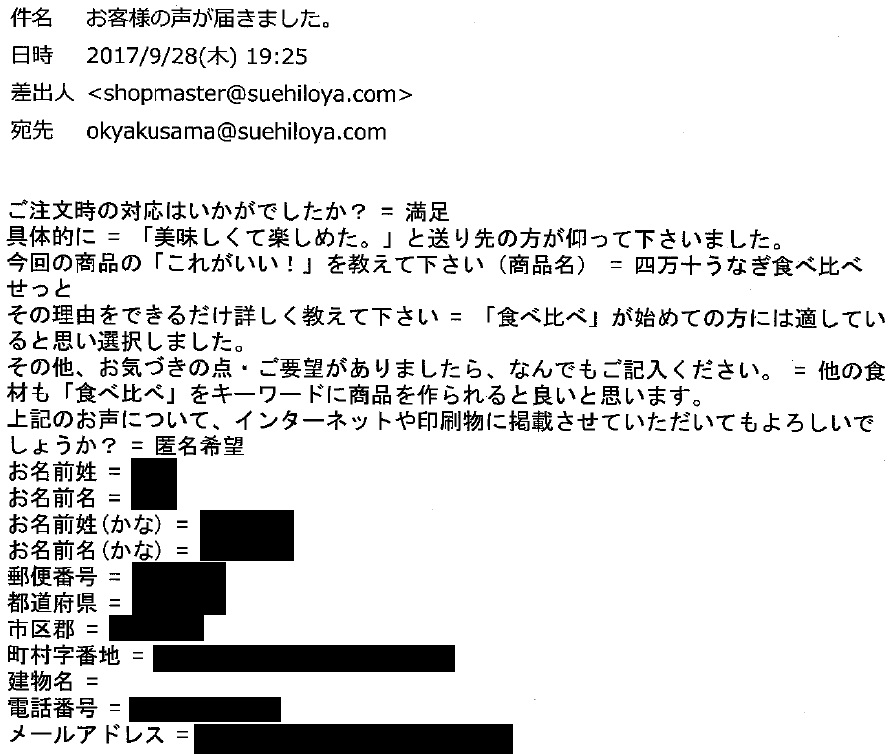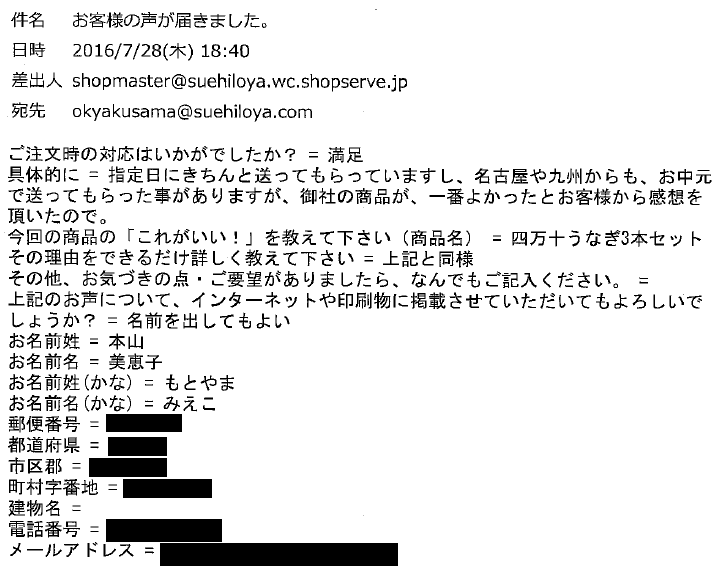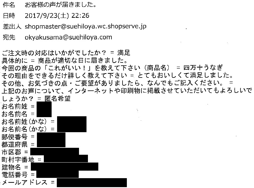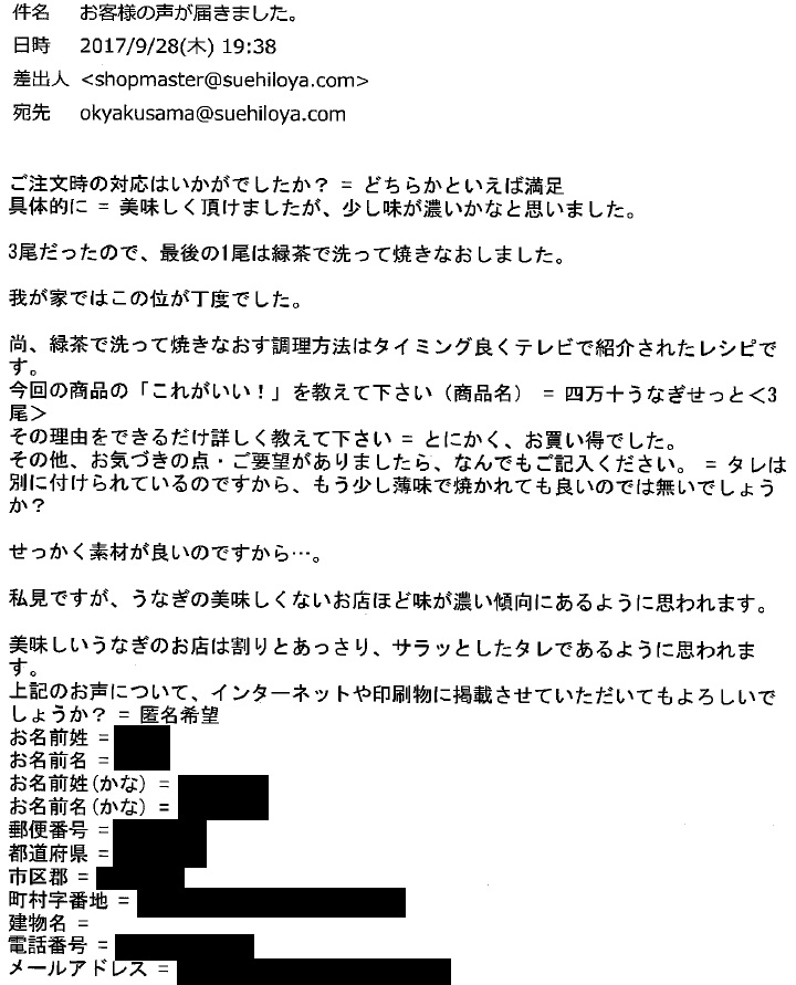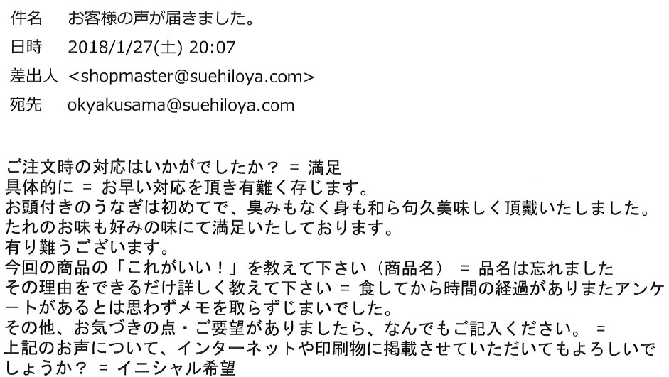 ご注文時の対応はいかがでしたか? = 満足 具体的に = 素早いスタッフ確認のメール。約束の日にきちんと届いた点も含めて良かったです! 今回の商品の「これがいい!」を教えて下さい(商品名) = うなぎ2尾せっと その理由をできるだけ詳しく教... -