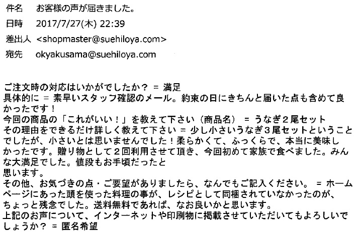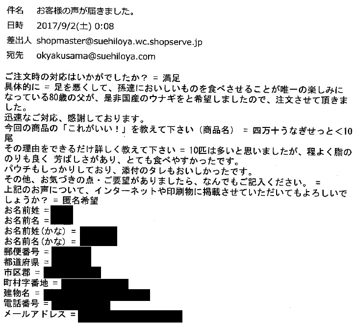 ご注文時の対応はいかがでしたか? = 満足 具体的に = 足を悪くして、孫たちにおいしいものを食べさせることが唯一の楽しみになっている80歳の父が、是非国産のウナギをと希望しましたので、注文させて頂きました。迅速なご対応、感謝しております。... -