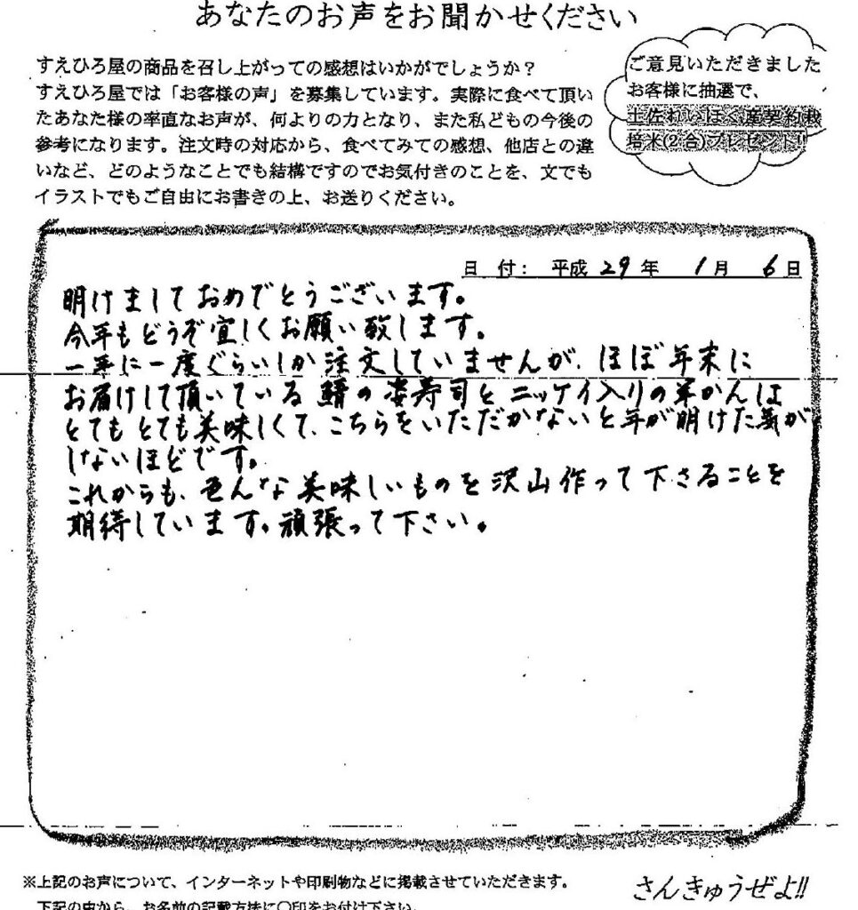 S.H. 様 (埼玉県) 【こんにゃく寿司・清水さば姿寿司・カマス姿寿司等をお買い求めいただきました。】