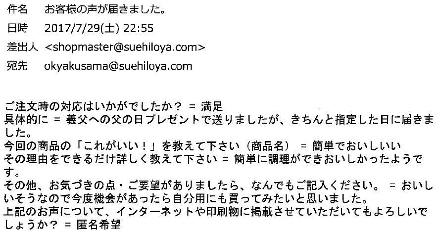 ご注文時の対応はいかがでしたか? = 満足 具体的に = 義父への父の日プレゼントで送りましたが、きちんと指定した日に届きました。 今回の商品の「これがいい!」を教えて下さい(商品名) = 簡単でおいしい その理由をできるだけ詳しく教えて下... -
