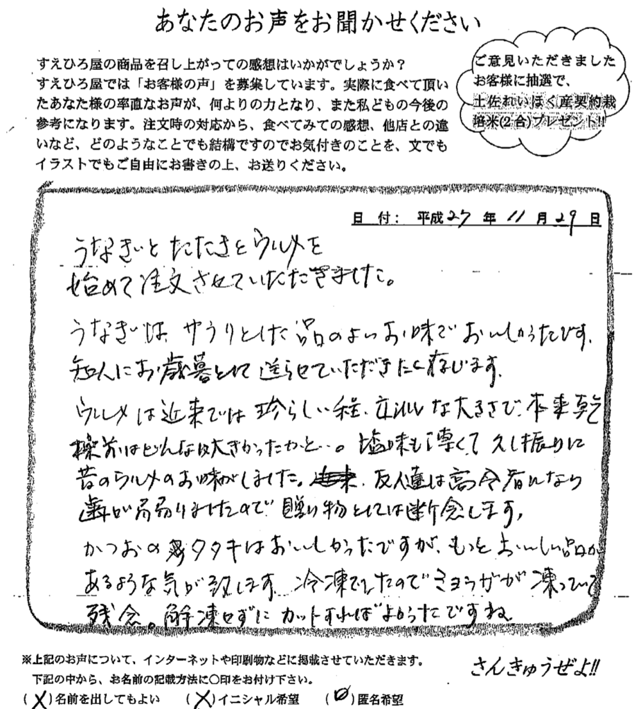 親川敦子 様 (大阪府) 【2013土佐の旬のうまいもん頒布会3月をお買上げいただきました。】