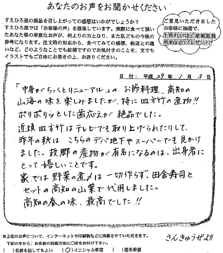 T.M. 様 (高知県) 【おせち・清水サバ姿寿司・田舎寿司せっと・大丸・鉄干しをお買い求めいただきました。】