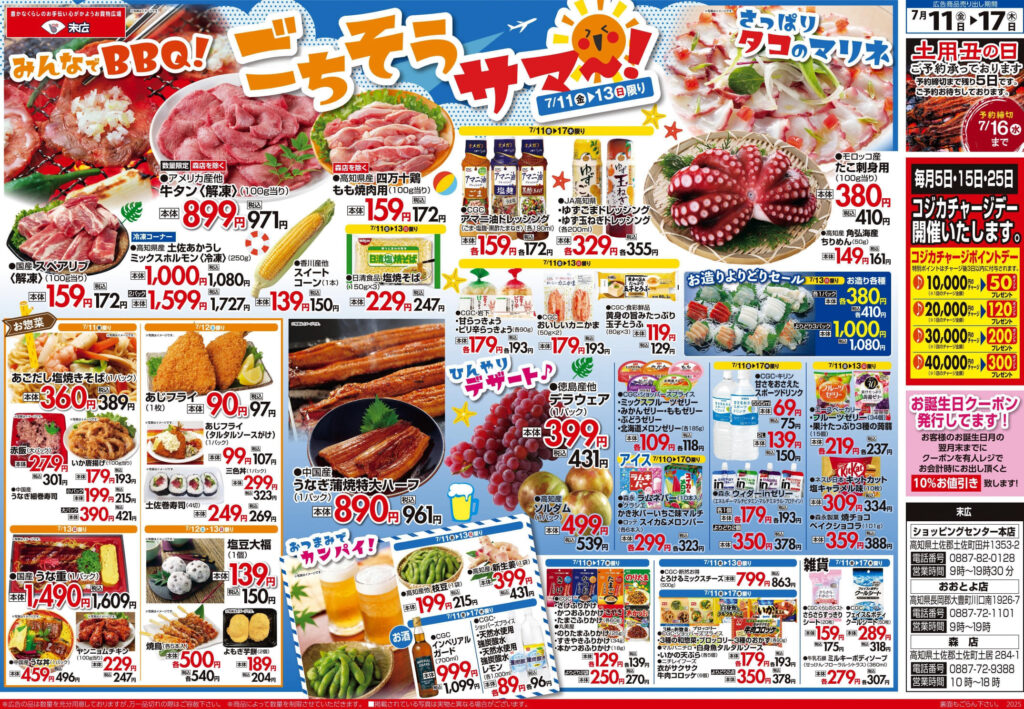 7月11日~7月17日のチラシは「みんなでBBQ!ごちそうサマ~! たこ刺身用 410円」