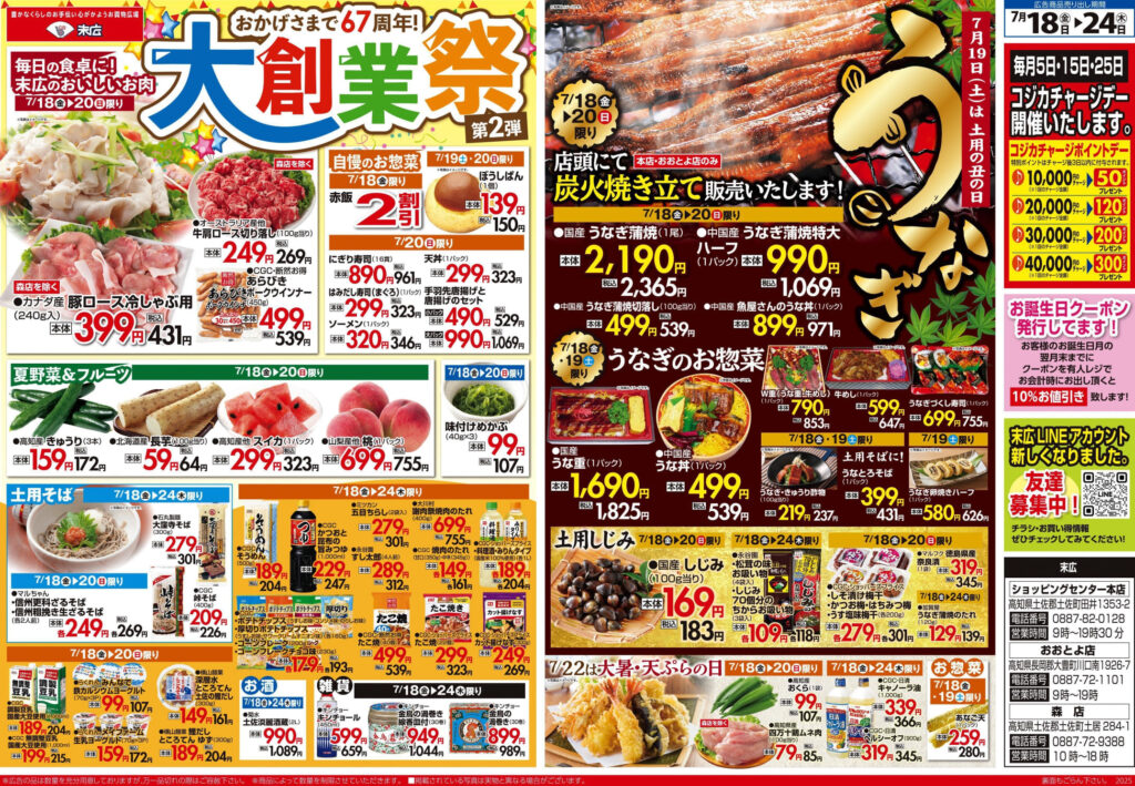 【末広チラシ情報】ネットでチラシを確認できます。 7月18日~7月24日のチラシは「大創業祭 第2弾 国産うなぎ蒲焼 2,365円」 詳細版PDFはこちら(1.5MB) -