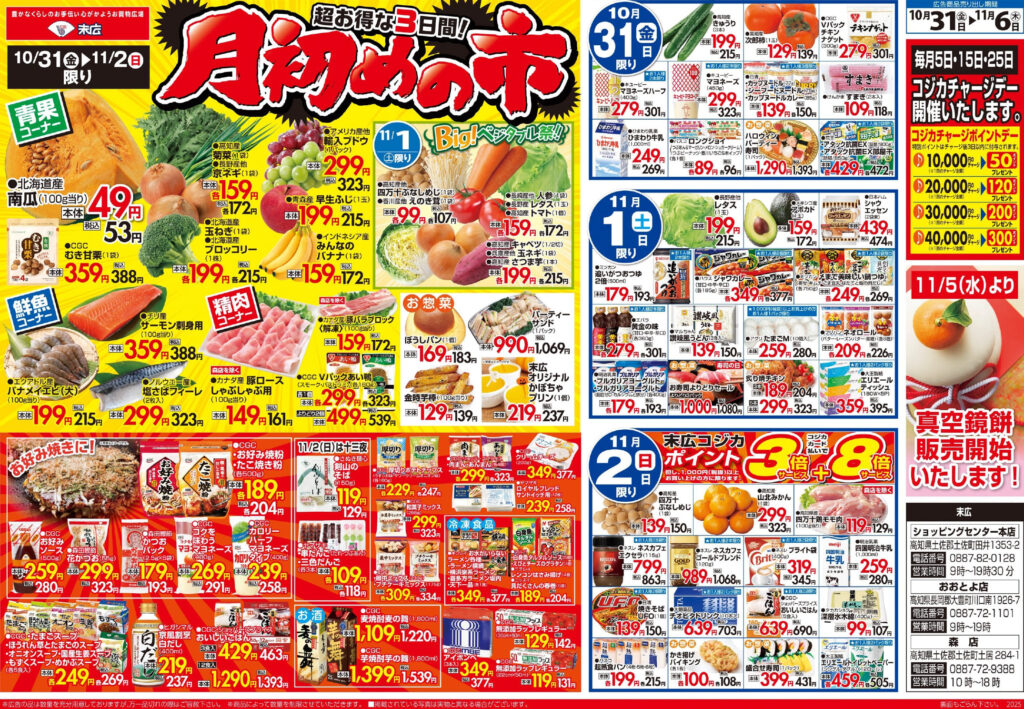 10月31日~11月6日のチラシは「月初めの市 バナメイエビ 215円」