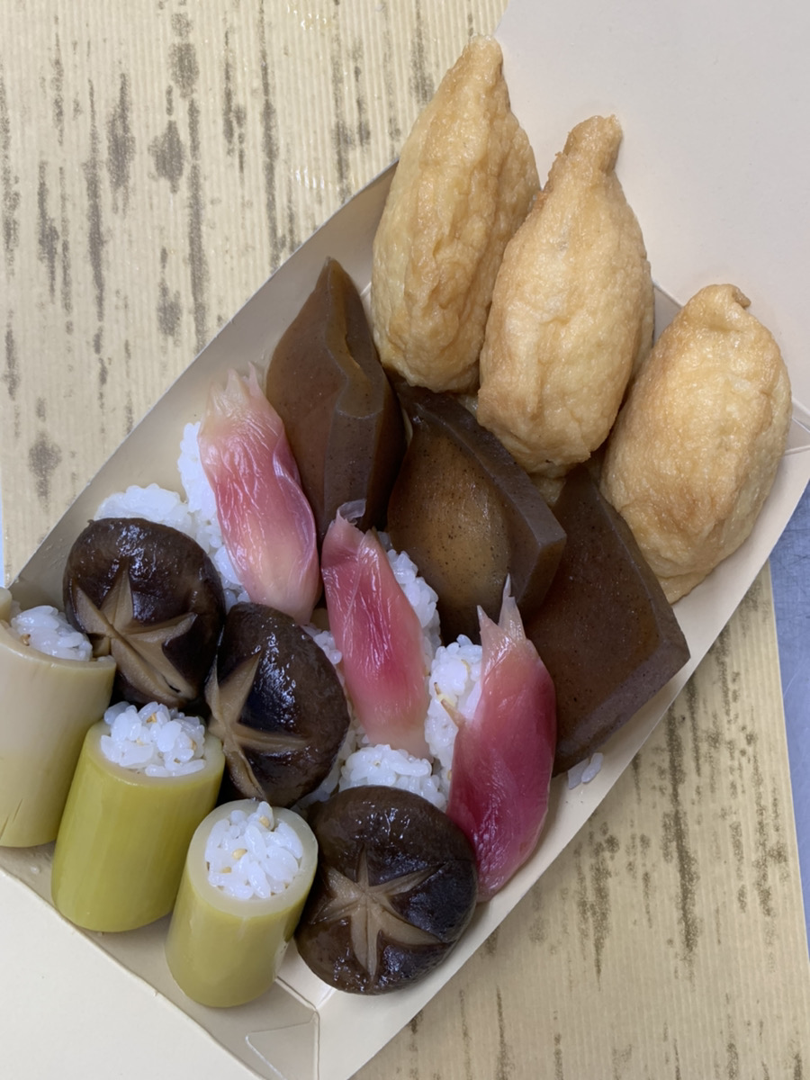 田舎寿司の具には、株式会社末広の通信販売・すえひろ屋で人気のお寿司5種類(たけのこ・しいたけ・こんにゃく・みょうが・いなり)を取り入れております。