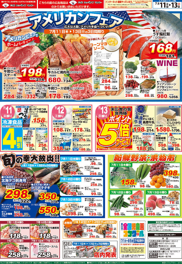 今日のチラシは「アメリカンフェア。アメリカンビーフでホームパーティー!牛肩ロースステーキ198円」