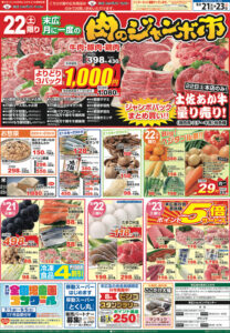 今日のチラシは「月に一度の肉のジャンボ市。牛肉、豚肉、鶏肉よりどり3パック1,000円」