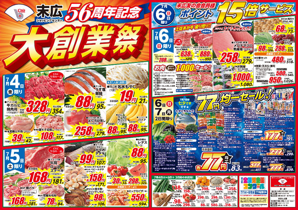 今日のチラシは「末広56周年記念大創業祭。牛カルビ焼肉用328円」